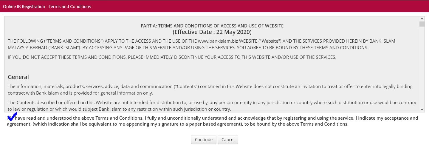 - Klik Continue untuk meneruskan urusan daftar Bank Islam.