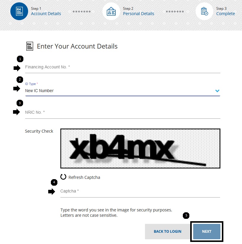Daftar dengan No Akaun Pembiayaan Anda kebiasannya nombor akaun pemmbiayaan atau pinjaman adalah 17 digit dan ID yang Anda gunakan untuk membuka akaun.