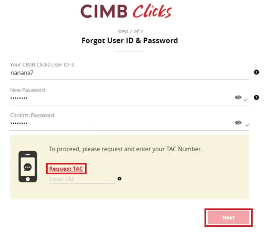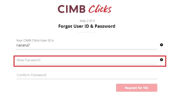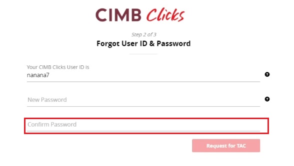 Nota: Sekiranya butang Request TAC untuk meminta TAC tidak ditemui pada skrin, ini bermakna TAC Anda sudah disekat atas sebab-sebab keselamatan. Oleh yang demikian, sila hubungi Pusat Panggilan CIMB Bank di talian +60362047788 untuk pengaktifan semula.