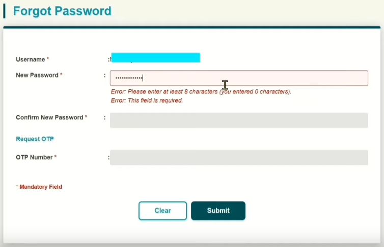 - Masukkan kata laluan baru pada ruangan New Password. (kata laluan mesti mempunyai huruf besar, huruf kecil, Contoh: Alizah45*)